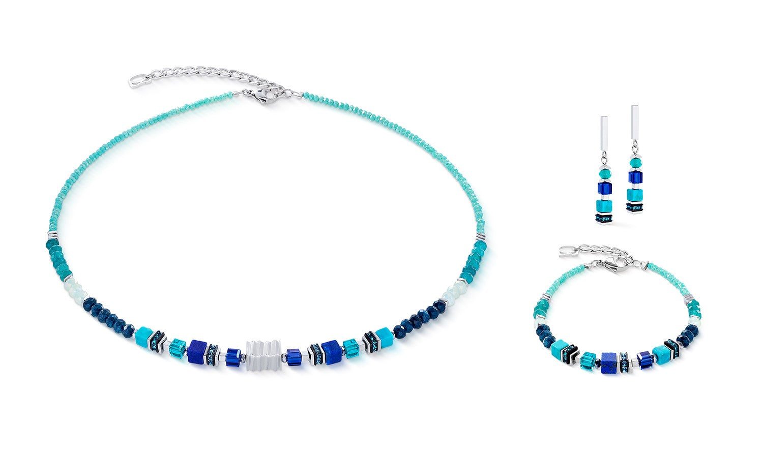 The Wave Precious Flow silver-teal bracelet translates the cool teal palette into a harmonious gemstone composition. Smooth lapis lazuli and turquoise cubes provide depth, complemented by faceted dyed jade and Swarovski crystals.