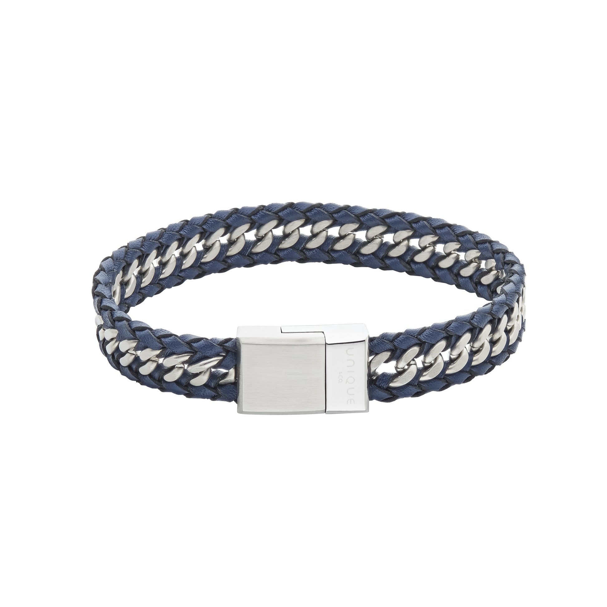 Navy leather and stainless steel bracelet with a magnetic fastener.