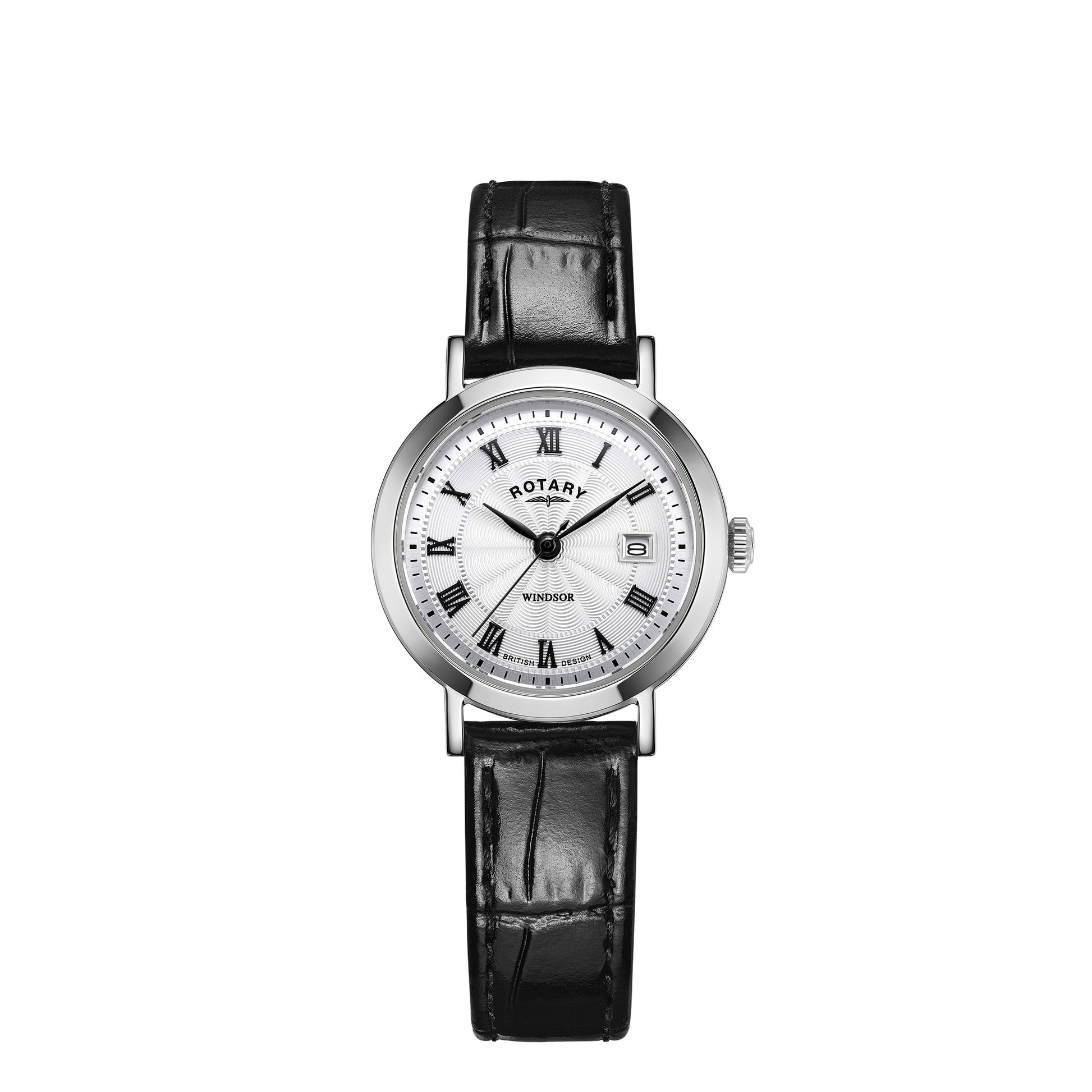 Silver coloured cased watch on a black leather strap, with a roman numeraled dial.