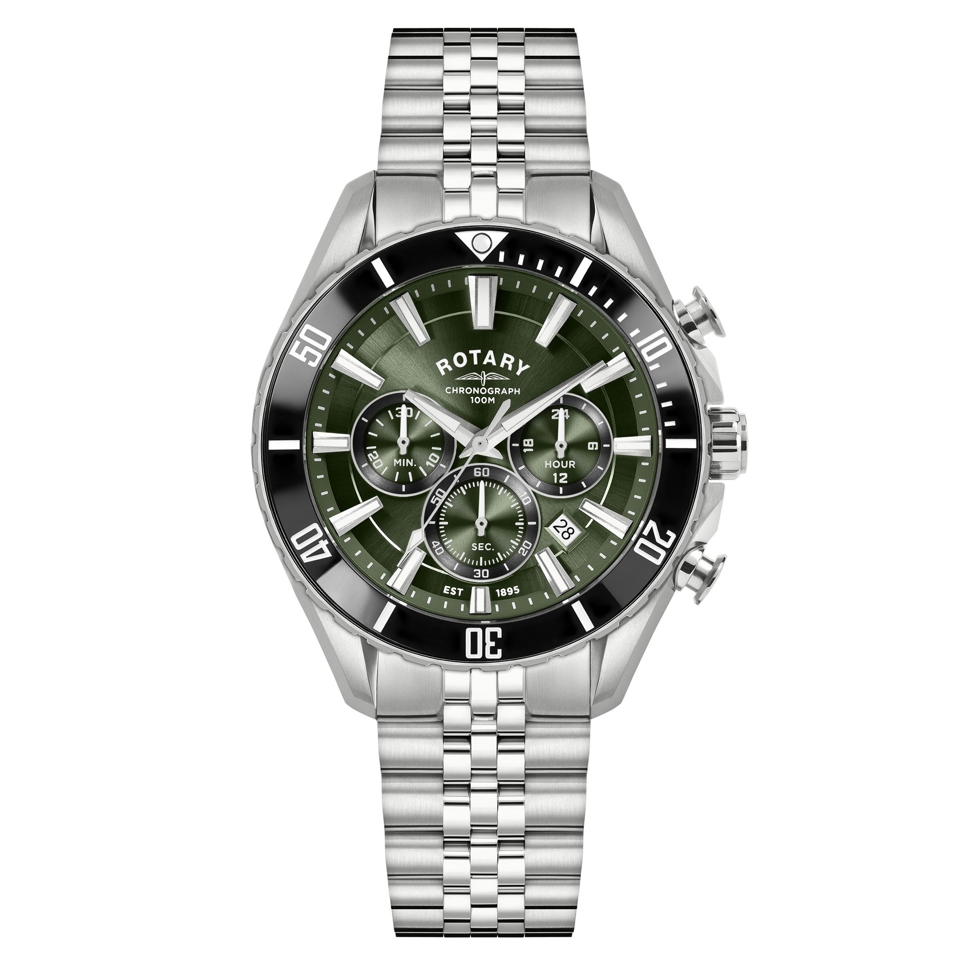 Stainless steel green chronograph dial watch on a stainless steel bracelet strap