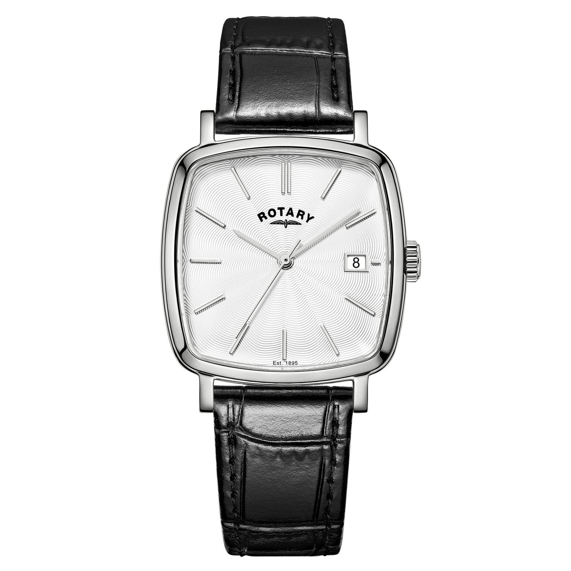 Stainless steel square watch with black leather strap